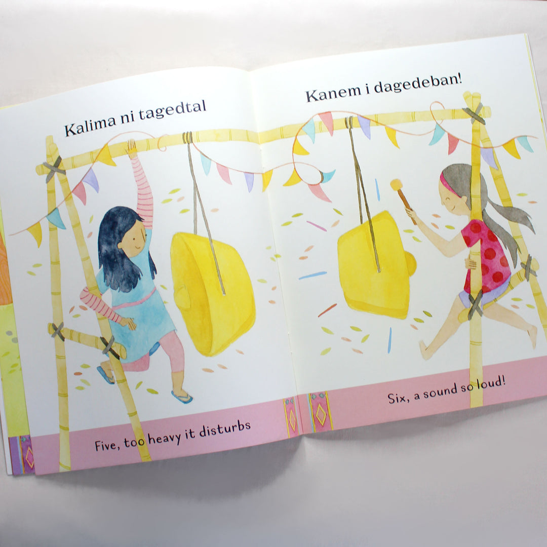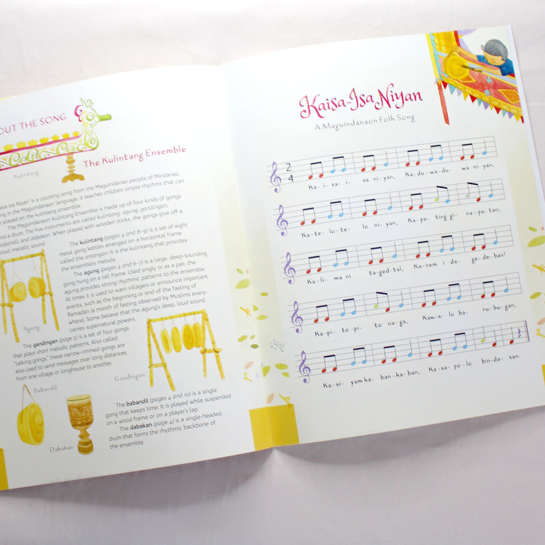The drawings of Fran Alvarez evoke the joy of finding harmony in the counting song, “Kaisa-isa Niyan.” Sung in the Maguindanaon language, Kaisa-isa Niyan teaches children simple rhythms that can be played on the kulintang ensemble.